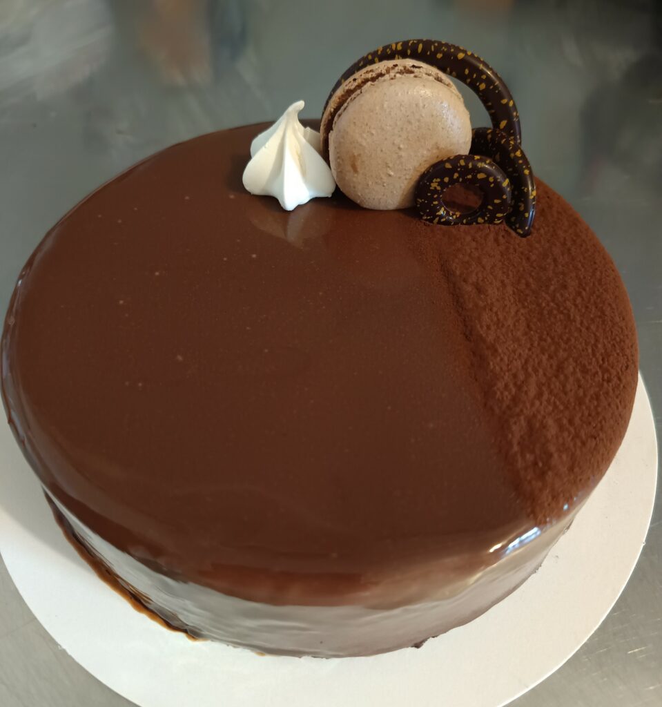 Royal chocolat/Trianon (biscuit cacao, croustillant praliné, mousse chocolat, glaçage miroir) : 5€/part